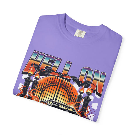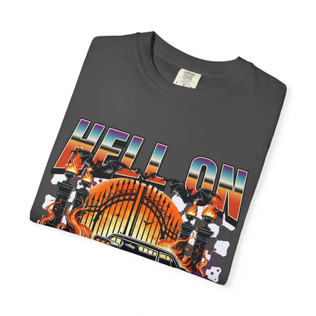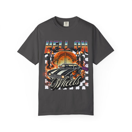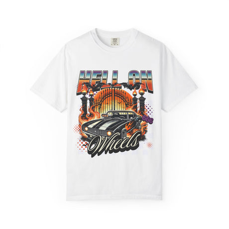 Hell on Wheels car graphic T-Shirt | vintage muscle car, gate and flames