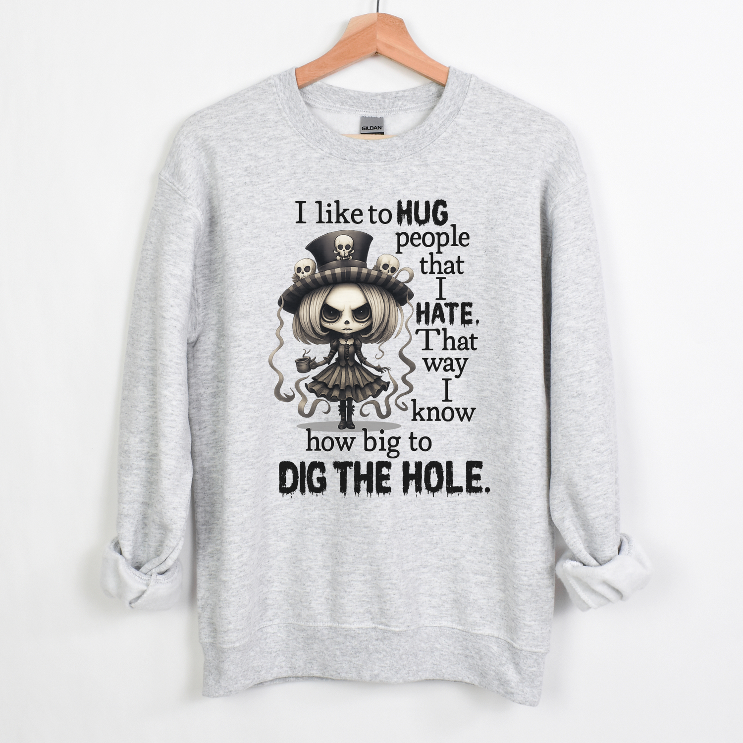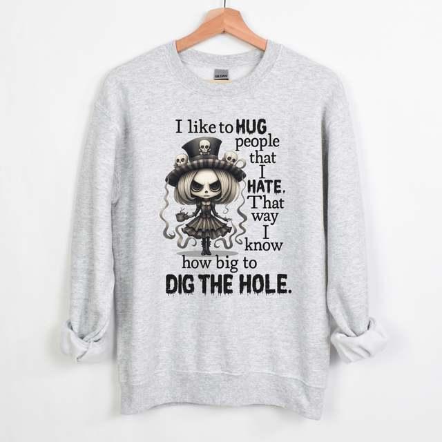 I LIKE TO HUG PEOPLE I HATE - Small / ASH SWEATSHIRT is backordered and will ship as soon as it is back in stock.