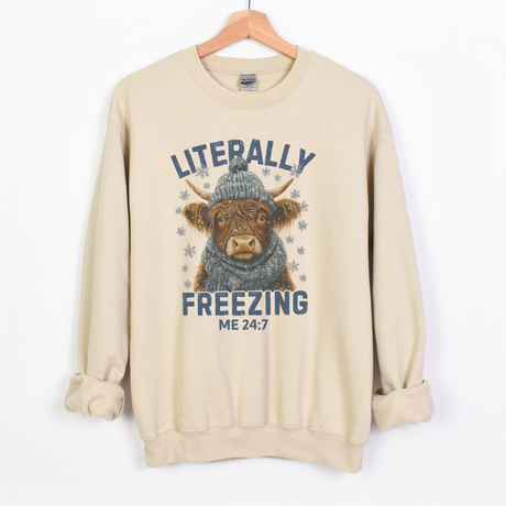 HIGHLAND COW LITERALLY FREEZING MARBLED TIE DYE OR SAND SWEATSHIRT