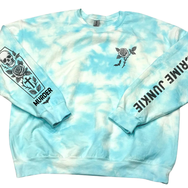 THIS GIRL LOVES TRUE CRIME W/SLEEVE GRAPHICS + OPTIONAL SWEATPANTS TO MATCH - Small / TEAL TIE DYE SWEATSHIRT is backordered and will ship as soon as it is back in stock.