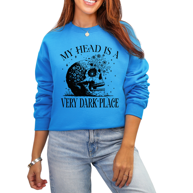 MY MIND IS A VERY DARK PLACE - Small / Sapphire SWEATSHIRT is backordered and will ship as soon as it is back in stock.